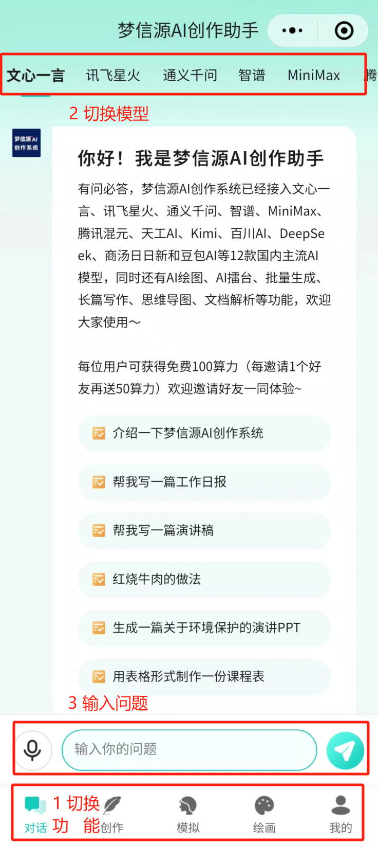 内容基本上是一样的,也是在下方输入问题,然后在上方去选择模型进行提问,在下方底栏当中有对话、创作、模拟,还有绘画,这些功能都可以去使用