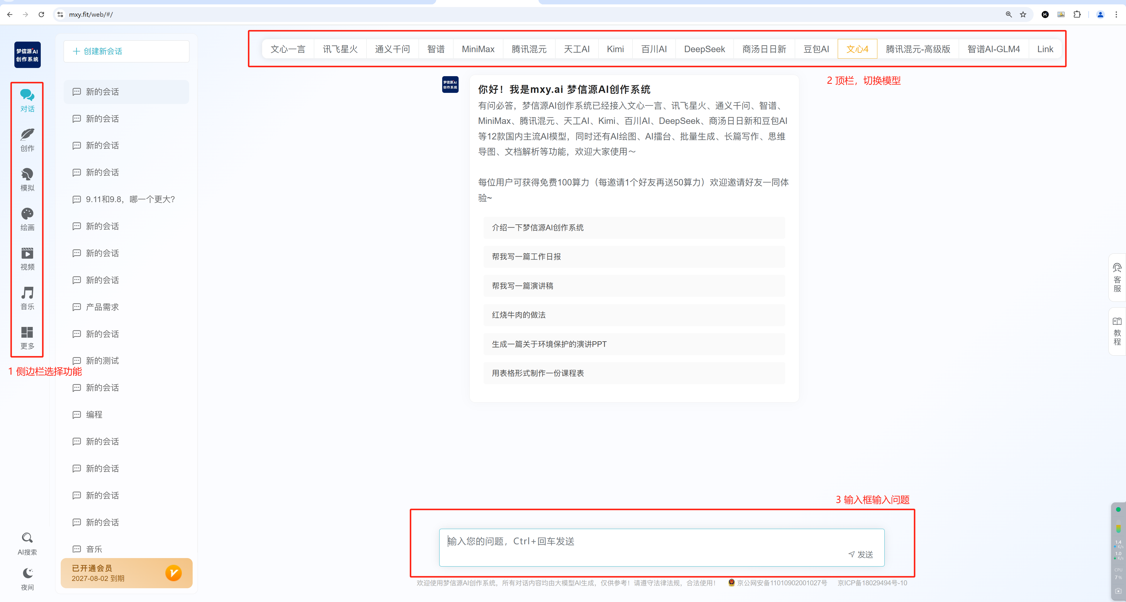 在左侧栏当中,我们可以去切换其他的功能,比如说是创作,模拟角色、绘画、视频、以及有一些独特的应用,比如说AI擂台、批量生成、长篇写作、思维导图以及文档解析等等;