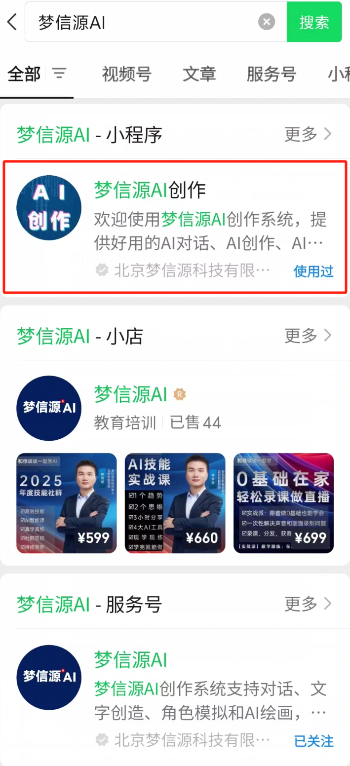 在手机端我们可以直接搜索 梦信源AI,点击搜索,搜索之后我们可以看到有小程序,也有我们的公众号,通过小程序进入之后,我们也可以直接进行使用