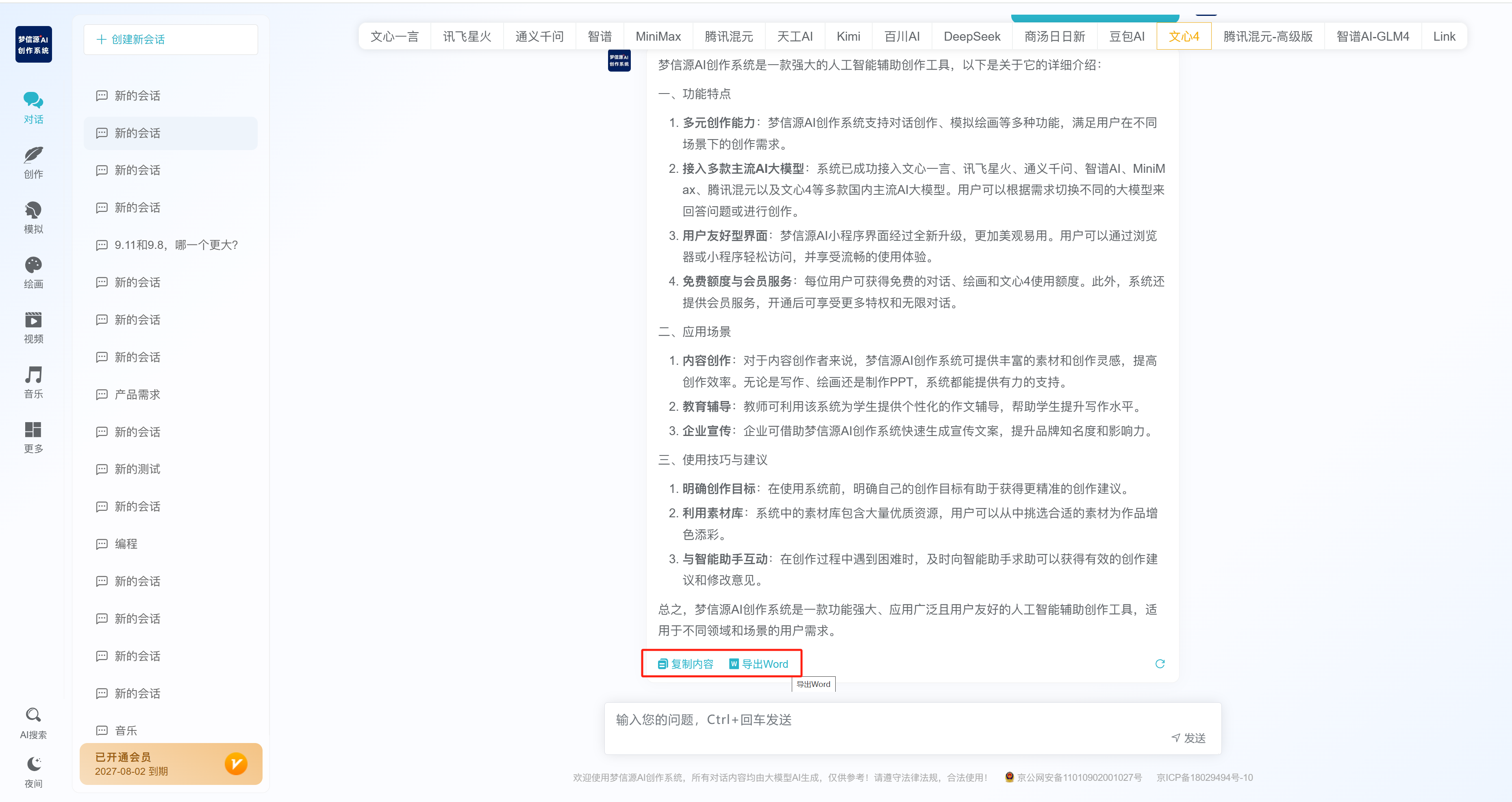 当这个回答完成之后,可以使用这个复制内容,直接把内容复制在剪贴板上,或者是导出为Word文档