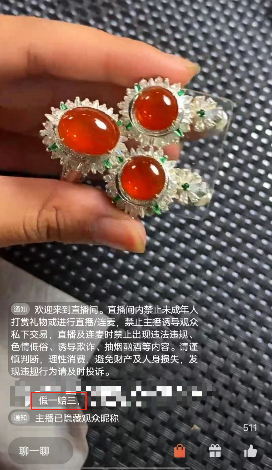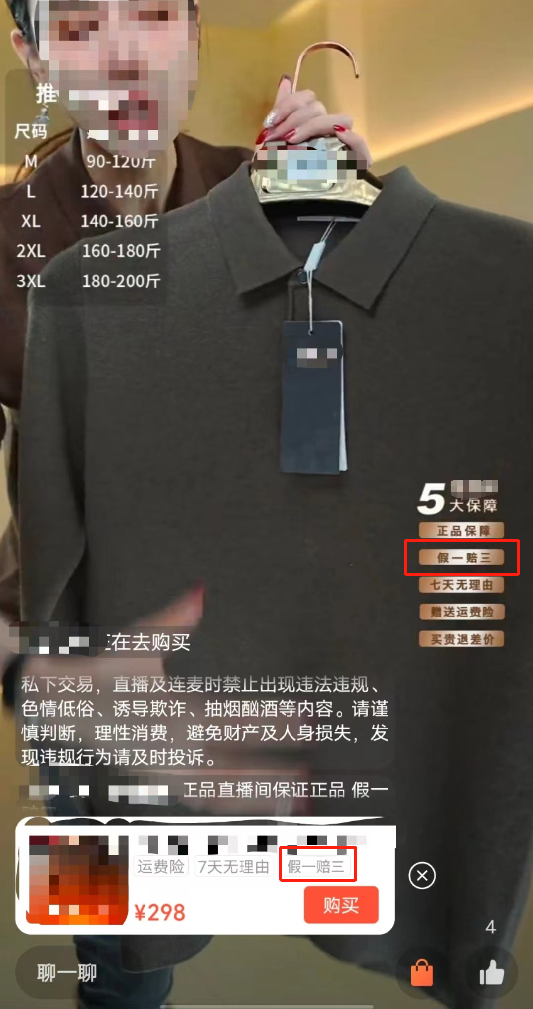 直播间屏幕贴图宣传“假一赔三”,且商品有“假一赔三”服务 | 直播公屏宣传“假一赔三”,但相应的商品无“假一赔三”服务 | |